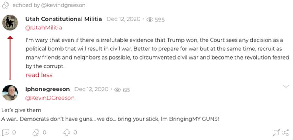 But that wasn't his only interaction with the Militia's account. He wrote, on Dec. 12 in response to a parley on civil war," "Let’s give them a war ... Democrats don’t have guns ... we do ... bring your stick, I'm bringing MY GUNS!"