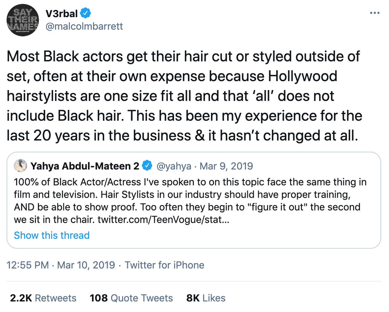 ‘“Hollywood hairstylists are one size fit all and that ‘all’ does not include Black hair,”’ Barrett tweeted. “This has been my experience for the last 20 years in the business & it hasn’t changed at all.”