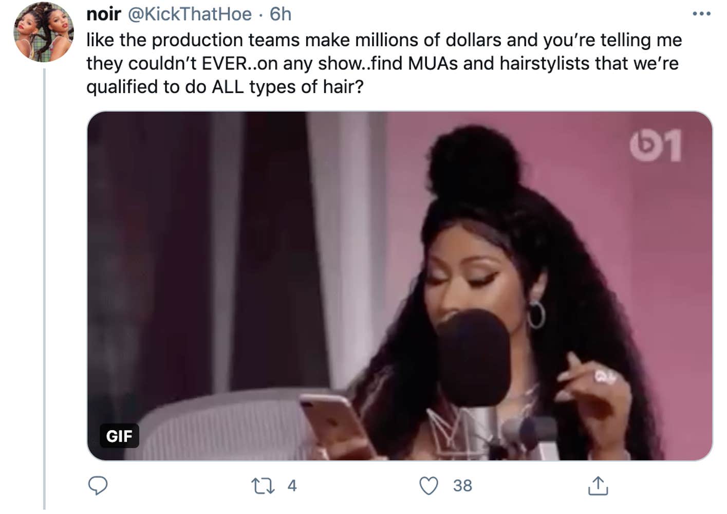 Twitter user @KickThatHoe said, “like the production teams make millions of dollars and you’re telling me they couldn't EVER..on any show..find NUAs and hairstylists that were qualified to do ALL types of hair?”