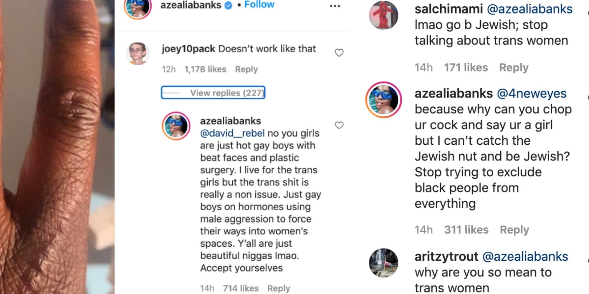Azealia Banks is once again under fire after she resorted to transphobic comments in response to followers who said she can’t assume a Jewish identity just because she’s engaged to a Jewish man.