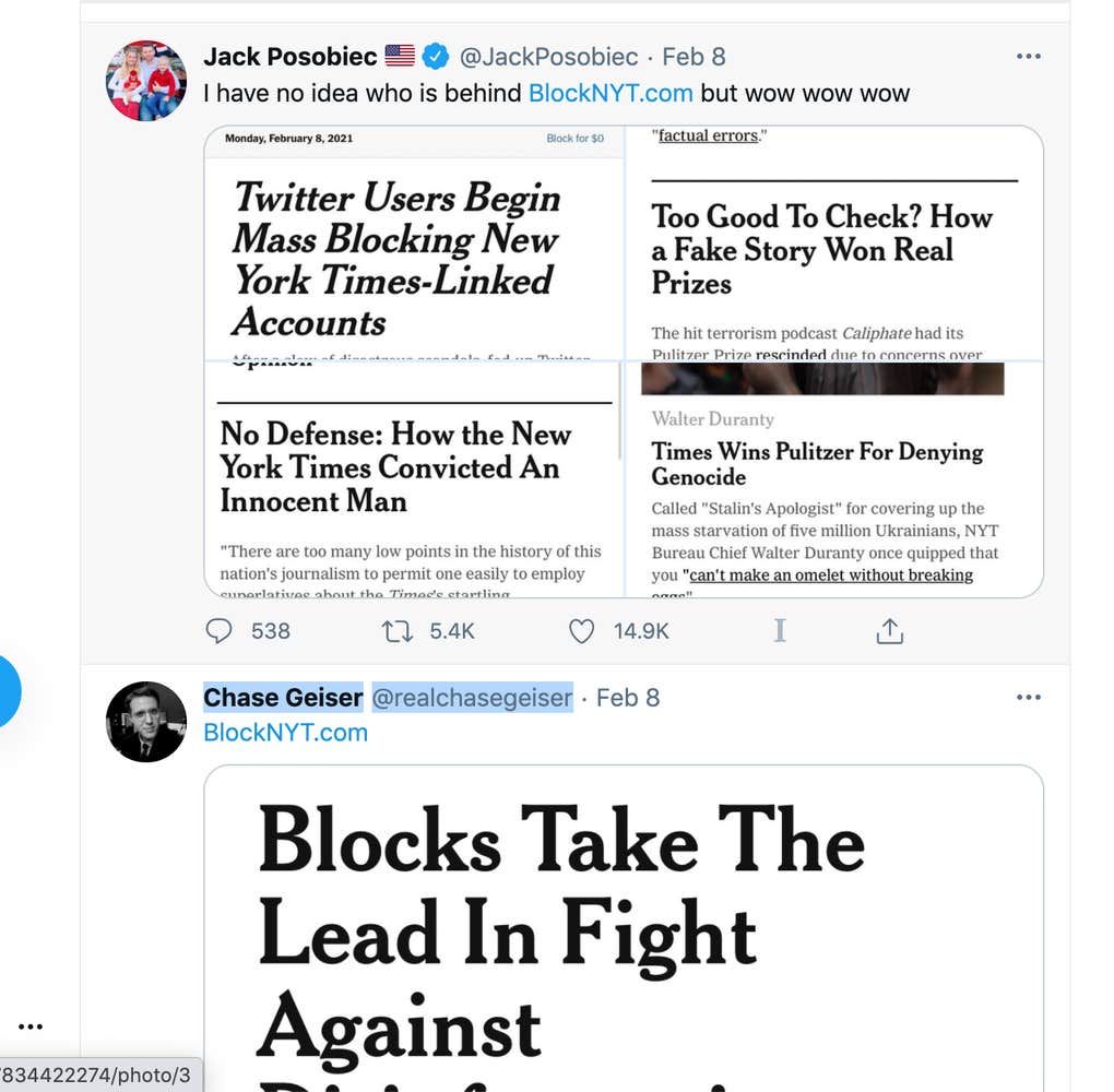 But it's much more likely the same far-right media that rushed to share it are similarly behind it. The second person to ever tweet about it was conspiracy theorist Jack Posobiec, claiming, "I have no idea who is behind http://BlockNYT.com but wow wow wow.