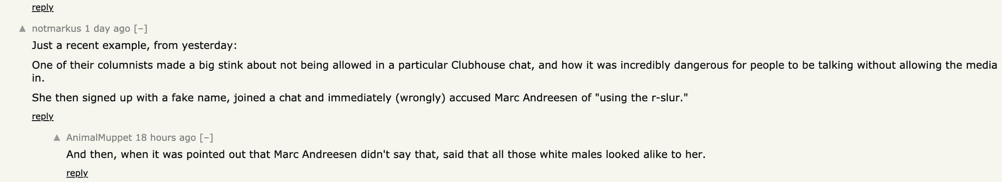 One of the first places the Block NYT list was posted was to Y Combinator's news aggregator site. Times reporter Taylor Lorenz was recently in a kerfuffle with some of the biggest names in tech after she mistakenly called out venture capitalist Marc Andressen for using a slur on Clubhouse. That specific incident was cited in the chat on the site.