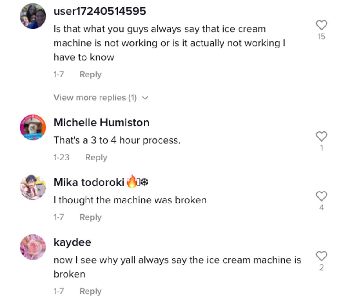 Others are commenting on how tedious the task seems for the workers and that they now understand why the ice cream machine is always out of commission. "Now I see why y'all always say the ice cream machine is broken," one said.