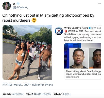 The two men reportedly photobombed a spring breaker a day after Englehardt’s body was found, according to the New York Post. De’Asia Skillerm posted the photo featuring herself posing while the two men can be seen walking down Ocean Drive in the background. One of the men is also posing. “Oh nothing just out in Miami getting photobombed by rapist murderers,” Skillerm wrote on Monday in a tweet that’s been liked over 300,000 times.
