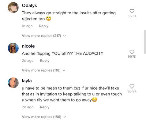 Her initial video has been liked 3.3 million times and viewed nearly 14 million times since being posted on Thursday. The video was sadly all too relatable for many women. “Why do they think we want to talk to them so bad? If i don’t know you i don’t care to have a conversation w/ you,” one viewer questioned.