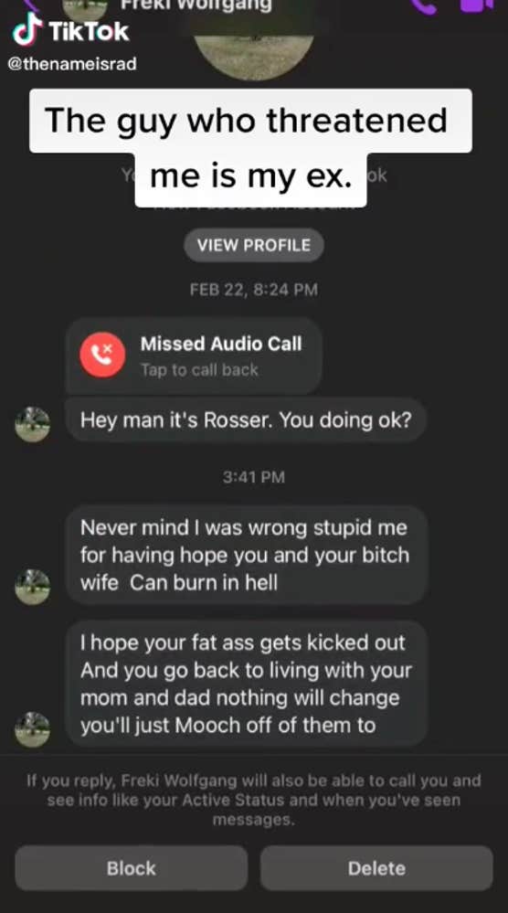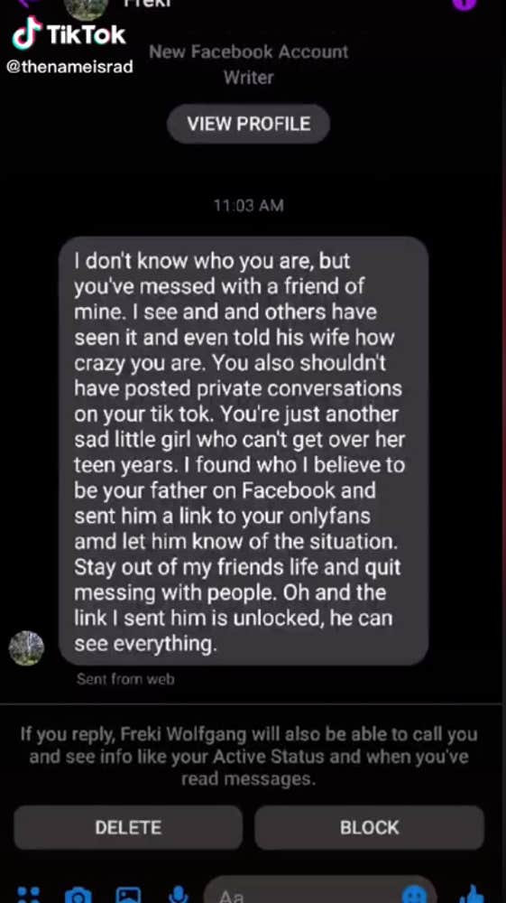 In the third video, RAD posted a screenshot of a DM she received from someone claiming to be a "friend" of the ex or his wife. "You're just another sad little girl," the person wrote. "Stay out of my friends (sic) life and quit messing with people."