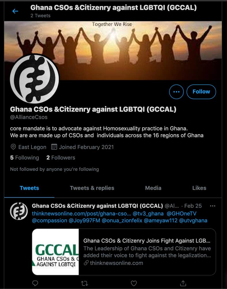One Twitter account, “Ghana CSOs & Citizenry against LGBTQI (GCCAL)," was created to specifically advocate against the LGBTQ community. The account linked to a statement that in part called on the “Judiciary to prosecute all who indulge in acts of homosexuality in Ghana according to our current laws.”