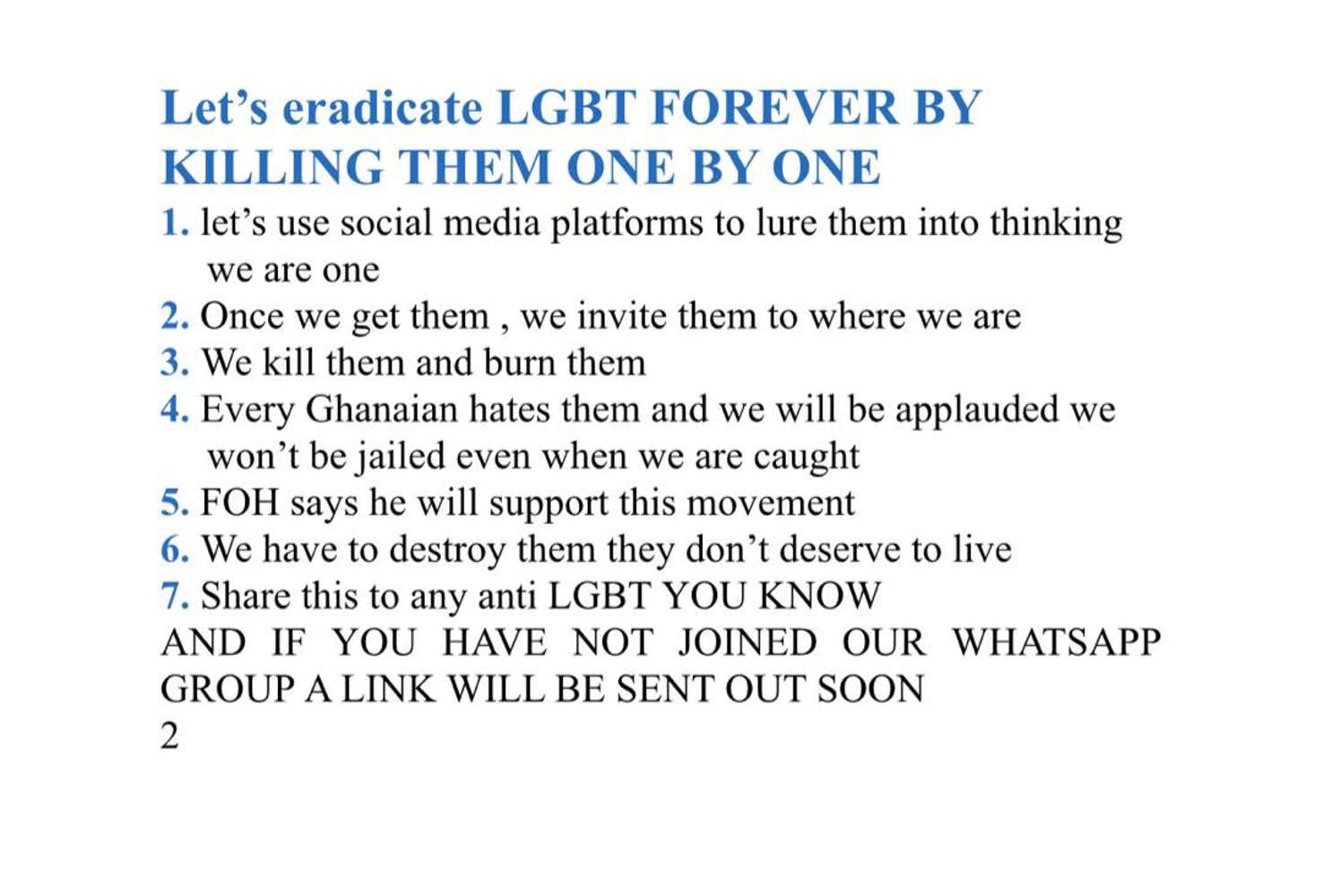 A chilling image circulating on Twitter calls to kill LGBTQ+ persons “one by one.” “Every Ghanaians hates them and we will be applauded we won’t be jailed even when we are caught,” reads part of the text. “We will kill them and burn them."