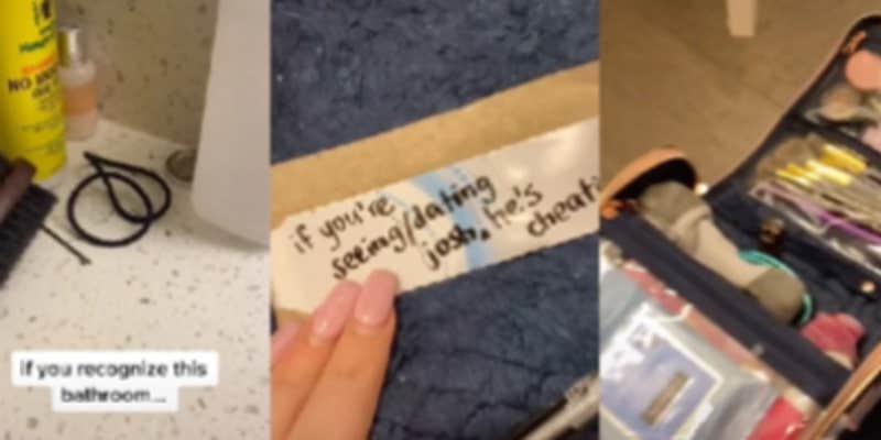In a video, TikToker Molly Sharpe pans around her date's bathroom and eventually lands on some hair ties and other “female products” that triggered her suspicion he has a girlfriend—a case full of makeup brushes, Neutrogena wipes, among other items. “His roommate is single, and I thought he was, too. But if this is your man, he’s cheating,” Sharpe says. She wanted to make sure that if her date does have a girlfriend, and doesn’t simply happen upon the TikTok and recognize the bathroom for herself, she would still know that she’s being cheated on. So Sharpe left a note inside the case, too.