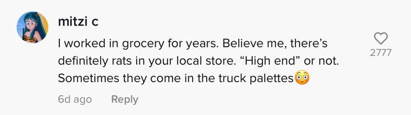 "I worked in grocery for years," @ritzzzzzzz69 wrote. "Believe me, there's definitely rats in your local store. 'High end' or not. Sometimes they come in the truck palettes."