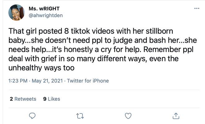 "That girl posted 8 tiktok videos with her stillborn baby..." @awrightden wrote. "She doesn’t need ppl to judge and bash her...she needs help...it’s honestly a cry for help. Remember ppl deal with grief in so many different ways, even the unhealthy ways too."
