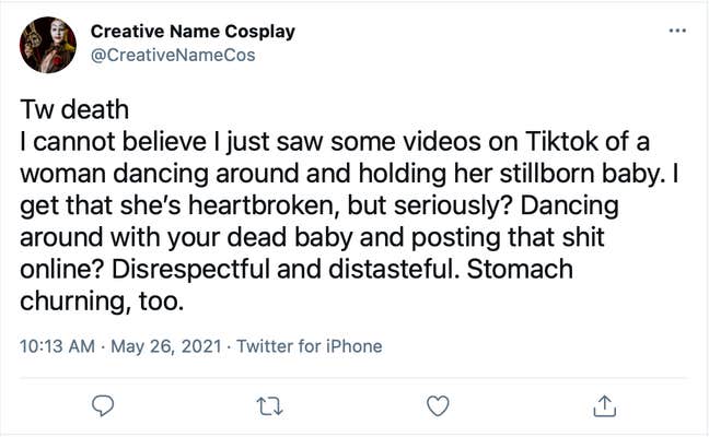"I cannot believe I just saw some videos on Tiktok of a woman dancing around and holding her stillborn baby," @CreativeNameCos wrote. "I get that she’s heartbroken, but seriously? Dancing around with your dead baby and posting that shit online? Disrespectful and distasteful. Stomach churning, too."