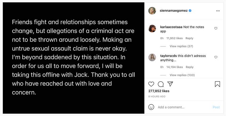 "Friends fight and relationships sometimes change, but allegations of a criminal act are not to be thrown around loosely," she wrote. "Making an untrue sexual assault claim is never okay. I'm beyond saddened by this situation."