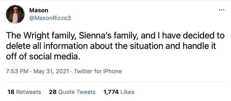 "The Wright family, Sienna's family, and I have decided to delete all information about the situation and handle it off of social media," Rizzo wrote late Monday.