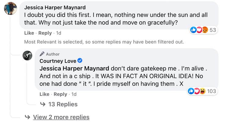 When one person indicated that the Live Through This cover wasn’t necessarily unique either, Love said “don’t [you] dare gatekeep me” and reinforced her statement that the art was original.