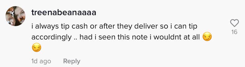 There were also people who said the note would've deterred them from tipping. "I always tip cash after they deliver so I can tip accordingly... had I seen this note I wouldn't at all," @treenabeanaaa wrote.