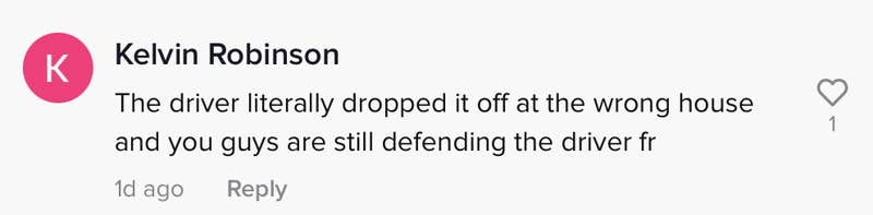 "The driver literally dropped it off at the wrong house and you guys are still defending the driver (for real)," @Kelvinrobinson5 wrote.