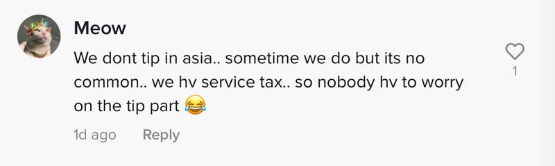 "We don't tip in Asia... sometime we do but its no common... we (have) service tax... so nobody (have) to worry on the tip part," @meowwwwwwwwgggg wrote.