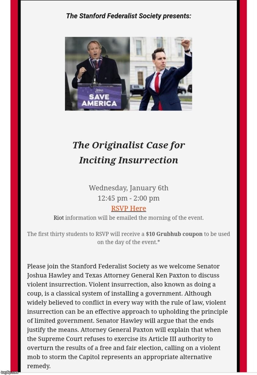 The flyer said the event was being organized by the Stanford Federalist Society and that it would take place on Wednesday, Jan. 6, the date of the Capitol insurrection. The flyer was sent out on Jan. 25 in an email listserve, Slate reported, indicating that it was a statement on the incident and not an actual event.
