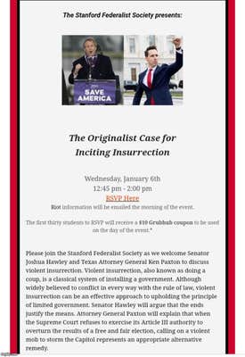 The Stanford wing of the Federalist Society had refused to condemn the society members’ involvement in the Capitol insurrection, which the flyer seemingly mocked.