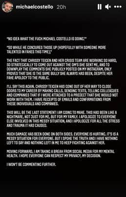 "'No Idea what the fuck Michael Costello is doing,'" Costello's post read, quoting Teigen. "'So while he conjures those up (hopefully with someone more talented in fakes this time),' The fact that Chrissy Teigen and her crisis team are working so hard, so strategically to come out against the DM's she sent me, and to downplay the comments she publicly posted on my Instagram, only proves that she is the same bully she has always been, despite her fake apology to the public."