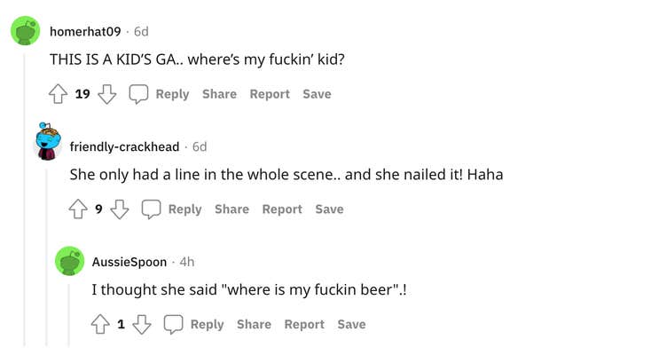 “THIS IS A KID’S GA.. where’s my fuckin’ kid?” one user commented. Another replied, “She only had a line in the whole scene.. and she nailed it! Haha.”