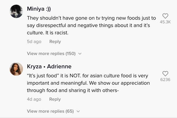 “They shouldn’t have gone on TV trying new foods just to say disrespectful and negative things about it and its culture,” said one viewer. “It is racist.”