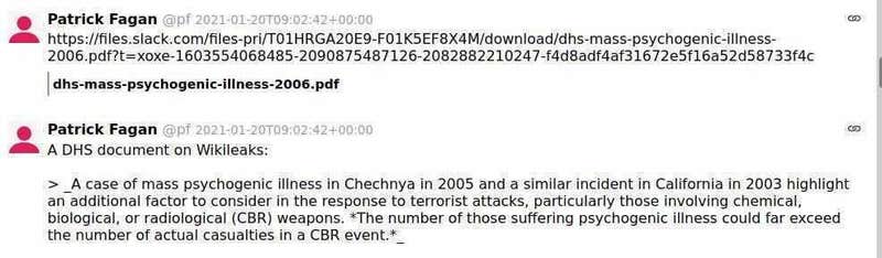 Aside from his own documents, Fagan also shared a file from the Department of Homeland Security (DHS) regarding "mass psychogenic illness," a phenomenon that occurs when a group of people simultaneously feel sick despite no infectious agent being present.