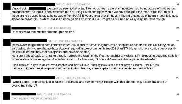 The leaked messages appear to indicate that several chat rooms were set up in the wake of Fagan's paper with names such as "Nudge" and "Psych ops." The Nudge room, according to screenshots of its description, involves "strategy materials to effect change in public beliefs / behaviour."