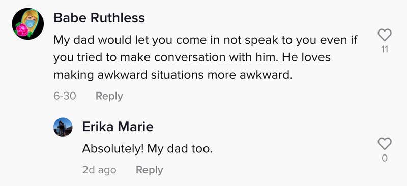 Another said their dad would purposefully make the man feel more awkward by refusing to talk to him. “He loves making awkward situations more awkward,” the user commented.