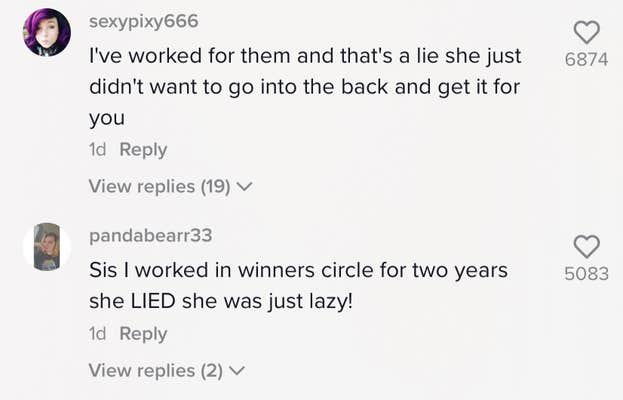 “I’ve worked for them and that’s a lie she just didn’t want to go into the back and get it for you,” one viewer said.