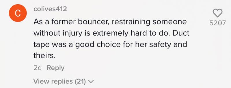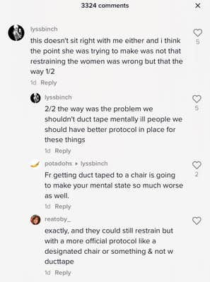 "I think the point [@lol.ariee] was trying to make was not that restraining the [woman] was wrong but that the way was the problem," @lyssbinch wrote. "We shouldn't duct tape mentally ill people we should have better protocol in place for these things."
