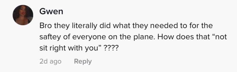 "Bro they literally did what they needed to for the safety of everyone on the plane," @gwenythlb wrote. " How does that 'not sit right with you?'"