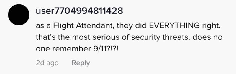 "As a flight attendant, they did EVERYTHING right," @thatjerseygirll wrote. "That's the most serious of security threats. Does no one remember 9/11?!?!"