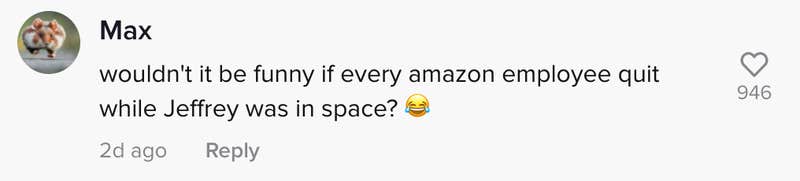 “Wouldn’t it be funny if every Amazon employee quit while Jeffrey was in space?” one user commented.