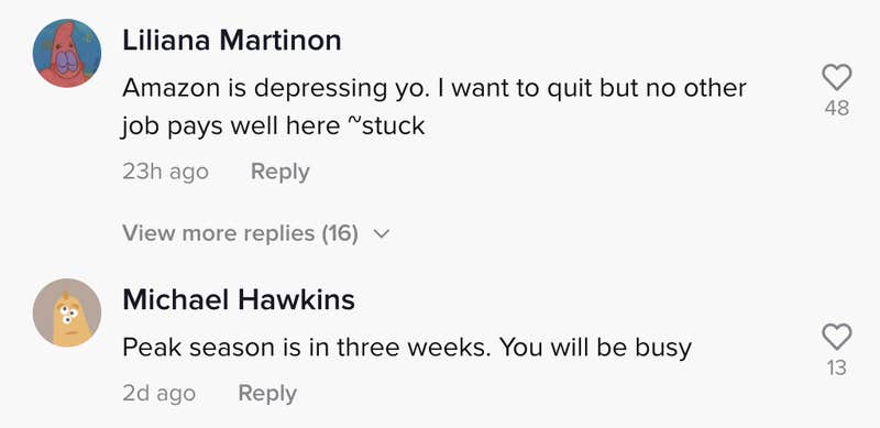 “Amazon is depressing,” one user commented. “I want to quit but no other job pays well here. Stuck.”