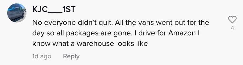 “No, everyone didn’t quit,” the user commented. “All the vans went out for the day so all packages are gone. I drive for Amazon. I know what a warehouse looks like.”