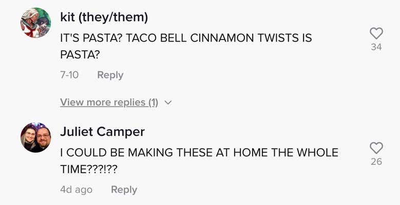 “IT’S PASTA? TACO BELL CINNAMON TWISTS IS PASTA?” one user asked.