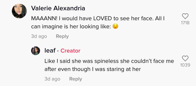 Leaf told them “see you later” then walked away “feeling amazing” for getting everything off her chest after such a long time. Carrie refused to make eye contact, and Leaf yelled goodbye to another coworker nearby, letting Carrie know she was leaving without actually speaking to her.