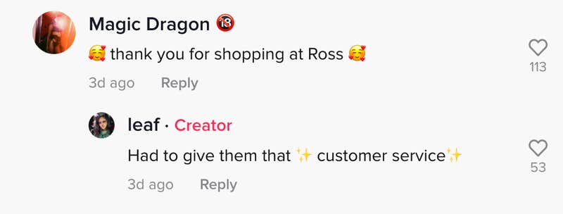 “Thank you for shopping at Ross,” one viewer commented. Leaf replied, “I had to give them customers service.”
