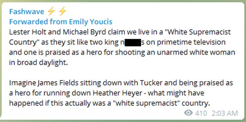 One widely-circulated post by the Emily Youcis Telegram channel refers to Byrd and Holt by the N-word and compared Byrd to the man who killed anti-racist protester Heather Heyer during the Unite the Right rally in 2017.
