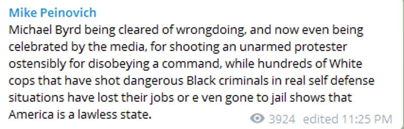Numerous far-right Telegram channels compared Byrd shooting Babbitt to white police officers killing Black men. One said that killing Babbitt was "a far more blatant murder than what happened to George Floyd." Many used racial slurs and other derogatory language and tropes.