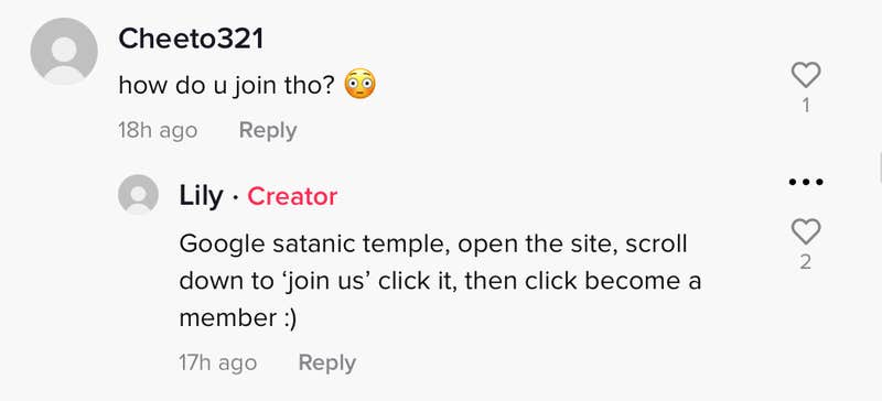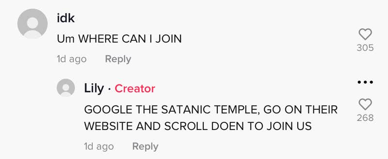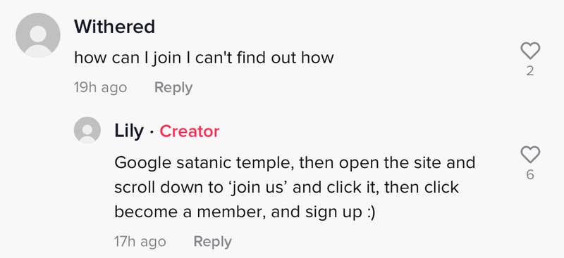 The Daily Dot has reached out to @L1lyall3n on TikTok via DM, as other social media accounts could not be located. We have also reached out to The Satanic Temple.