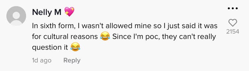 "In sixth form, I wasn't allowed mine so I just said it was for cultural reasons," they wrote. "Since I'm POC, they can't really question it."