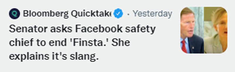 New York Magazine ran a piece called, "Senator asks hall of fame terrible tech question." The piece did not point out that Blumenthal had defined a finsta earlier in the hearing.