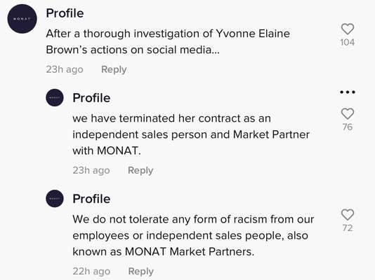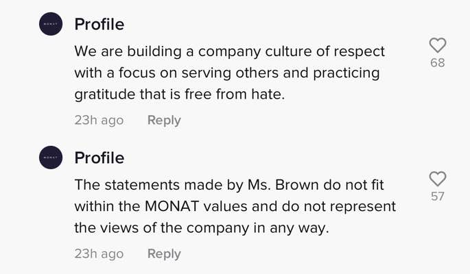 In the comment section of another video posted by @pandorasbreadbox, the company Brown had worked for, Monat, stated that she had been terminated.