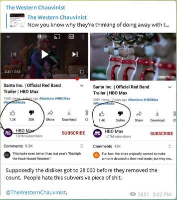 Claims are circulating that YouTube disabled the "dislike" count after tens of thousands disliked the Santa Inc. trailer.
