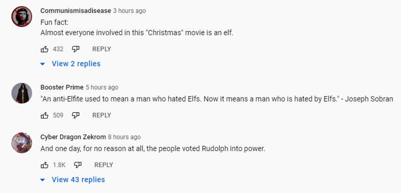 The top commenter, Man of Low Moral Fiber, has a verified YouTube channel with 100,000 subscribers. He wrote, "Did you know? Elves have been knocked off of at least 109 shelves? Somehow they always end up climbing back on and making rules about knocking them off."