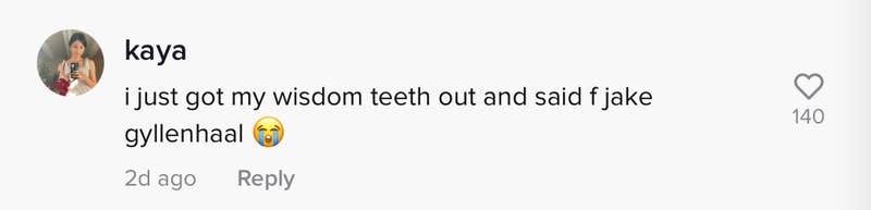 Another commenter wrote that they also recently had their wisdom teeth removed and similarly said "F Jake Gyllenhaal" while recovering from the sedative.
