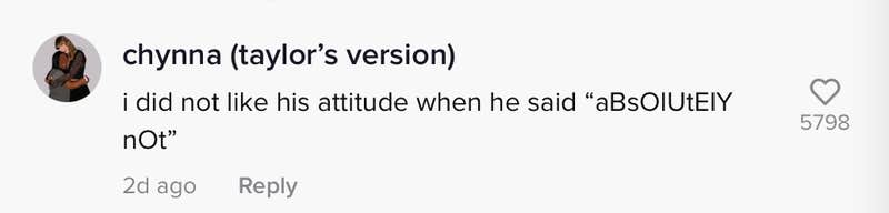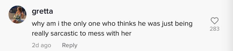 "Why am I the only one who thinks he was just being really sarcastic to mess with her," one commenter wrote.